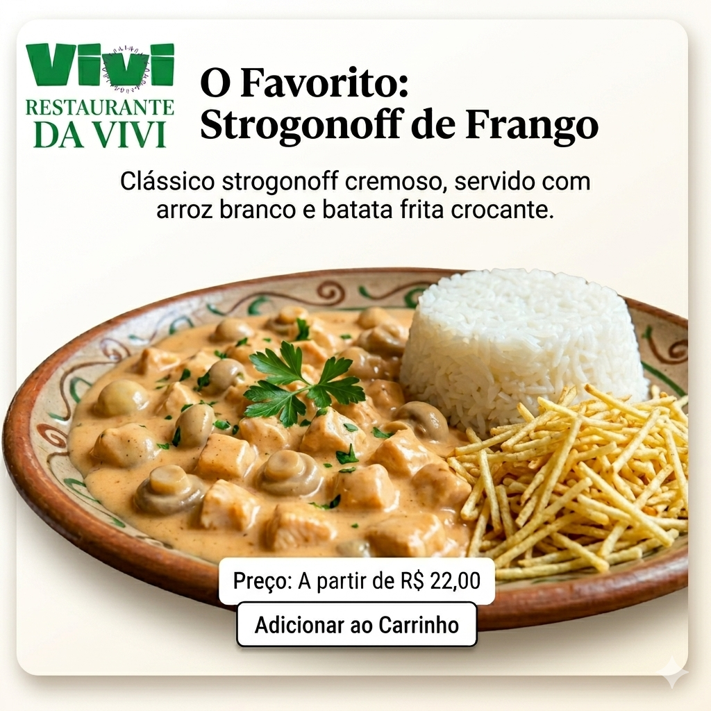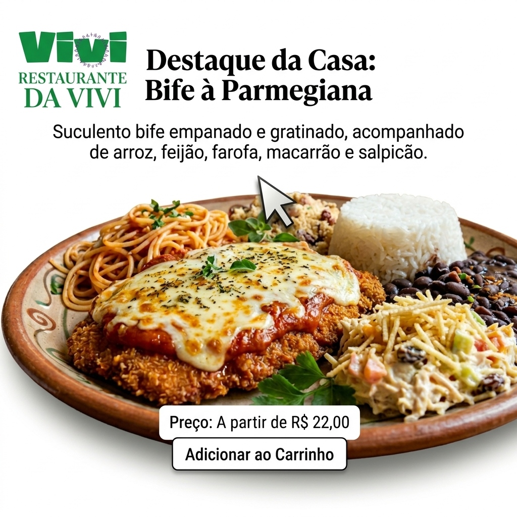 Restaurante da VIVI Comida caseira feita com ingredientes selecionados e aquele tempero especial que você só encontra aqui. Peça agora e receba quentinho no conforto da sua casa! Cardapio Web Ifood Whatsapp A Linha Bom e Barato da Vivi: Pratos Caseiros, Preços Baixos! Instagram FaceBook